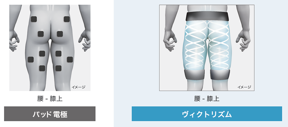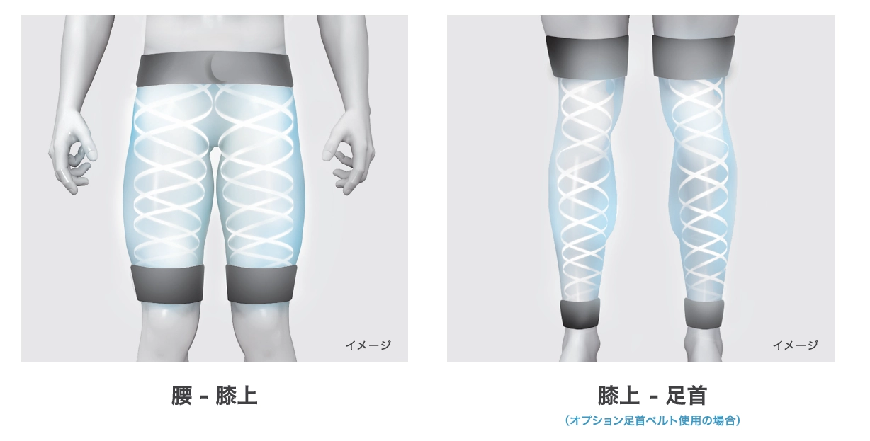 ベルト状の電極を足に巻きつけ電気を筒状に流すことで、表面だけでなく立体的に下肢全体の筋肉運動をおこなうため、飛躍的に運動効果を高めます。