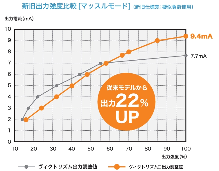 新旧出力強度比較(社内測定/擬似負荷使用)。従来モデルに対して、同一強度設定での出力電流が約22%UP。